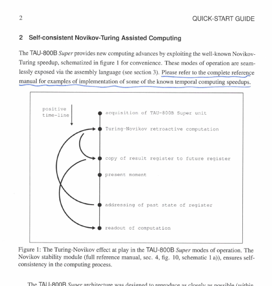 This extraordinary technology enables it to complete tasks in an impossible amount of time, since it can bend time to reach into the future and retrieve an answer which has not yet been calculated, and use it to produce the value which itself will have been read when the world reaches that point in the future (does your head hurt yet?). However, great care must be taken to ensure that the execution of the program does not create any temporal inconsistency events (the manual is filled with warnings and disclaimers of liability to this effect)!